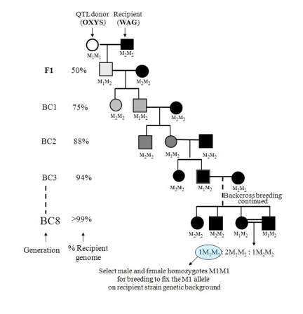 The construction of a congenic strain is a standard procedure of experimental mammalian genetics [4, 12, 37] originating from the work of G.D. Snell [33] on histocompatibility loci. Figure 2 outlines the procedure for moving a polymorphic marker gene from one inbred (donor) strain to another inbred (recipient) strain. In our study congenic strains were produced in accordance with the traditional approach: a QTL allele from the OXYS strain was introgressed into the WAG strain, which showed no signs of cataract and retinopathy development. The transfer of the OXYS donor region was accomplished by first producing F1 offspring by the reciprocal crosses of donor OXYS strain with recipient WAG strain (female WAG×male OXYS and female OXYS ×male WAG) and then backcrossing F1 rats with rats of a recipient WAG strain to obtain BC1 progeny. In Figure 2, the donor at marker locus M has genotype M1M1, and the recipient is M2M2. Tail tip DNA was isolated by the standard proteinase K digestion method and offspring rats were genotyped to identify animals heterozygous for a desired chromo-some 1 segment (5 markers were used: D1Rat30, D1Rat54, D1Rat219, D1Rat117, D1Rat76, and D1Rat81) and homozygous for the highest amount of recipient alleles at markers outside the chromosomal region of interest. These animals (‘carriers’) were backcrossed with new WAG rats to generate BC2 progeny for genotyping. Thus, 8 backcross generations characterized by subsequent genotyping were produced, as shown in Figure 2. This was done to ensure that nearly 99% of the donor's OXYS genetic background had been replaced by that of the recipient WAG [26]. Upon completion of these 8 backcrosses, brother-sister mating of two heterozygotes created the desired chromosomal regions homozygous for the donor's alleles and yielded offspring in the ratio M1:2M1M2:1M2M2. Two homozygous offspring M1M1 were bred to fix the M1 donor marker allele (along with a cosegregating locus of interest) in the recipient background. The rats of the two congenic strains were designated formally as WAG /OXYS-1.1 and WAG /OXYS-1.2.