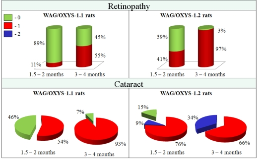 The cataract developed against the background of progressive retinopathy in congenic animals like in OXYS rats. At the age of 1.5-2 months, the signs of stage 1 retinopathy were found in 11% of the eyes of WAG/OXYS-1.1 rats. At the age of 3 months the retinopathy incidence in this strain was 55%. Interestingly, these values were approximately 2-fold lower than those in OXYS rats. In WAG/OXYS-1.2 animals at age 1.5-2 months, stage 1 retinopathy was observed in 41% of the eyes, but at 3-4 months 97% of the eyes were affected. Nonetheless, the animals of both congenic strains contained no cases of stage 2 retinopathy.