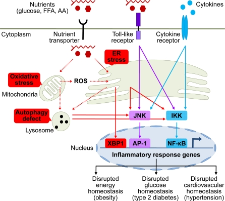 As a stress-response mechanism against adverse growth conditions such as nutrient depletion, and as a machinery to maintain normal intracellular environment, autophagy is key to cell/organism survival and proper functioning [106;107]. Unsurprisingly, autophagy defect has been linked to the development of a number of systemic diseases [115-125] including metabolic syndrome, T2D, and lipid abnormalities [126-133;200]. Of note, in the majority of these cases, the underlying pathogenesis lies in the failure of autophagy machinery to efficiently remove defective proteins or damaged organelles from the cytosol [107]. In terms of the pathogenic root of autophagy defect, chronic intracellular stress and particularly ER stress seem to be the critical upstream event. Indeed, ER stress has been shown to activate autophagy in mammalian cells through signaling crosstalk between autophagy and canonical UPR pathways [201;202]. Animal studies have shown that ER stress or oxidative stress induces adaptive autophagy upregulation in the early phase, which helps restoring intracellular homeostasis by disposing a number of harmful molecules such as unfolded or misfolded proteins in ER lumen, cytosolic proteins damaged by ROS, or even dysfunctional ERs and mitochondria [203-205]. However, when intracellular stresses remain unresolved, prolonged autophagy upregulation progresses into autophagy defect [139;140]. Given that ER stress pathway is closely linked to proinflammatory pathways mediated by IKKβ/NF-κB [196-198] or JNK [199], it is logical to predict that autophagy changes are linked to these inflammatory pathways. In parallel, autophagy pathway can relate to proinflammatory signaling via oxidative stress pathway, as shown by a very recent report [206] that autophagic counteraction of intracellular oxidative stress can suppress cellular inflammation by inhibiting oxidative stress-induced NLRP3 inflammasome activation. Indeed, recent literature has shown that autophagy defect can induce NF-κB-mediated inflammation in association with the development of cancer or inflammatory diseases (e.g., Crohn's disease) [207-211].