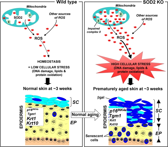 The counterpoint of deleterious and useful ROS roles may have provided evolutionary pressure to develop robust pathways for intracellular redox homeostasis including antioxidants such as glutathione peroxidases, peroxiredoxins, catalases and SODs. The first line of defence against ROS appears to be one of the superoxide dismutases, SOD2, (aka manganese superoxide dismutase (MnSOD)). SOD2 is a mitochondrial matrix protein that converts the superoxide anion (O2−) to hydrogen peroxide (H2O2), which is in turn, converted to molecular oxygen and water by catalase and peroxiredoxins. In this Aging paper, the Campisi group showed that normal aged mice exhibit impaired mitochondrial complex II activity and increased frequencies of senescent cells. They observed similar phenotypes in SOD2 knockout (KO) mice at very young ages and also reported that these mice exhibit significant epidermal thinning which is an age-associated phenotype in humans as well as mice. The epidermal thinning appeared to be due to decreased cellular proliferation in the senescent skin tissue rather than increased apoptosis. In addition, senescence in SOD2 KO mouse skin correlated with increased levels of two senescence markers, SA-βgal activity and the p16INK4a tumor suppressor, as well as amplified keratinocyte terminal differentiation (Figure 1). Moreover, these features are accompanied by the presence of nuclear DNA damage in the epidermis, a characteristic linked to senescence in both mouse and human cells in culture [6].