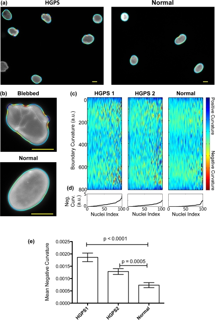 In an effort towards solving this issue, we present an automated image analysis method using curvature as the primary measure of blebbing. We used a custom-written program to extract the boundaries of immuno-stained nuclei and calculate a curvature contour for each nucleus among other measures of shape. We found that several measures of the shape differentiate between HGPS and normal control cell lines. We focused on the most intuitive measure, the mean negative curvature (MNC), which is the average of all the concave curvatures on the boundary of a nucleus. MNC provides a continuous measure of blebbing that can be used in quantitative and statistical methods. We analyzed different seeding densities (Figure S3) and exposure times (data not shown) to demonstrate that MNC is also a consistent measure that does not vary significantly between experiments. The cluster analysis also shows that intensity does not affect the measured MNC (Figure S2). Thus MNC values can be compared between samples and experiments, unlike values obtained from the traditional blebbing count method. One caveat is that MNC is affected by pixel size and smoothing, thus care should be taken when comparing results from different laboratories. Of the other measures that strongly correlate with MNC, according to our clustering analysis (Figure S2), solidity should not be significantly affected by pixel size or smoothing and thus may be a viable alternative.