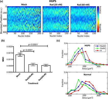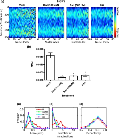 In parallel to the blind counting, we took immunofluorescence images of about 100 randomly selected nuclei per treatment group and automatically analyzed their nuclear morphology. Heat maps, which display the boundary curvature of the treated HGPS cells, are shown in Figure 3a. From the heat maps we see that the mock treated cells are much more blebbed than the rapamycin or RAD001 treated cells, which is consistent with our blinded counting. Indeed, we found that the MNC distributions of the rapamycin and RAD001 treated cells were statistically different from that of the control group (Figure 3b). Similarly, our analysis showed a reduction in the number of invaginations in treated HGPS cells (Figure 3d).