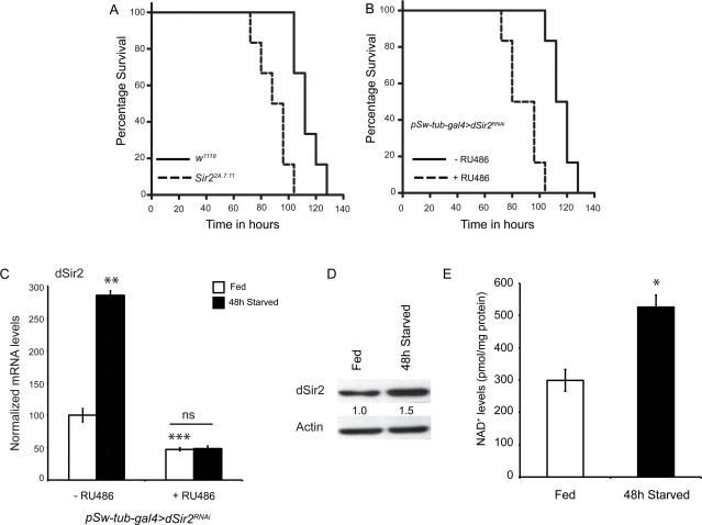 The activity of Sir2-like proteins has been demonstrated to be dependent upon intracellular NAD+ levels. Across organisms, increased NAD+ levels have been associated with increased activity and functions of Sir2 proteins [50-54]. To check if in addition to induction of dSir2 expression, there was an increase in NAD+ levels during starvation, we measured NAD+ in fed and starved, control and dSir2RNAi (+ RU486) flies (Figure 1E and Supplementary Figure 2). We found that NAD+ levels increased by 1.8 folds in response to starvation, similarly, in control and dSir2RNAi(+ RU486) flies (Figure 1E and Supplementary Figure 2). These results indicate that dSir2 expression and activity, in vivo, increases during starvation in flies.