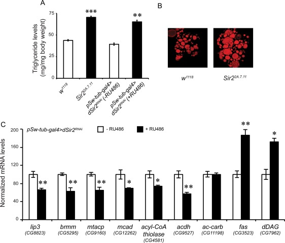 It is important to note that we obtained consistent phenotypic, metabolic and molecular readouts with respect to fat metabolism in dSir2-mutant and -RNAi flies. We have found that a decrease (or absence) of dSir2 expression results in increased fat storage in the fatbodies, as determined by oil red staining and biochemical analyses (Figures 2 and 3). This fat accumulation is due to altered expression of genes involved in fat metabolism (Figures 2 and 3). Importantly, we show that genes involved in fat breakdown are downregulated in the dSir2 knockdown flies, in addition to an upregulation of genes involved in fat synthesis (Figures 2 and 3). These findings are not only in accordance with the results obtained from dSir2 mutant larvae [54] but also implicate dSir2 as a key player in fat metabolism in adult flies.