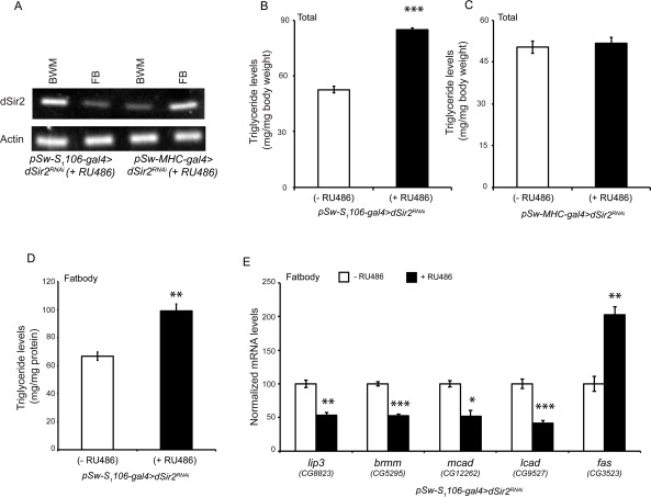 In order to check if the accumulation of TAGs was due to a failure in mobilization or utilization, we knocked down dSir2 in a tissue specific manner. While muscles utilize fat, fatbodies are considered equivalent to mammalian liver and adipose tissue. We knocked down dSir2 in the fatbody using the specific pSw-S1106-gal4 driver, which has previously been reported to be expressed in abdominal and head fatbodies [55, 56]. To knockdown dSir2 in the muscles, we employed the muscles specific pSwitch-MHC-gal4 driver [57]. Figure 3A (and Supplementary Figure 5) clearly show tissue specific knockdown of dSir2 in these flies. It is very interesting to note that fatbody knockdown of dSir2 led to an increase in TAG levels and mimicked the whole body dSir2RNAi (+ RU486) flies (Figure 2A). Surprisingly, knocking down dSir2 in the muscles did not affect TAG levels (Figure 3C), suggesting the importance of dSir2 in fat mobilization.