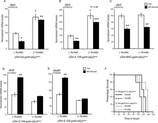 Insulin-IGF signaling (IIS) is another important nutrient sensing pathway that has been shown to mediate metabolic homeostasis and also affect organismal survival [59, 60]. Therefore, we wanted to check if dSir2RNAi (+ RU486) flies displayed abrogated IIS. Expression of dilp (insulin-like-peptide) genes has been documented to reflect changes in IIS under fed and starved conditions [61]. Using RNA isolated from fly heads, RT-qPCR analyses were performed to quantify the expression dilp-2, -3 and -5 from pSw-tub-gal4> dSir2RNAi (+ RU486) flies. We found that only dilp-2 and -5 levels were substantially altered in these flies (Figure 5A and Supplementary Figures 7A and 7B). However, it should be noted that the decrease in dilp5 expression that was observed during starvation in control flies [61] was absent in dSir2RNAi (+ RU486) flies (Figure 5A). We also did not see any changes in the expression of dilp6 levels in the fatbody of control and dSir2RNAi (+ RU486) flies (Supplementary figure 7C).