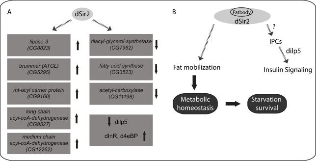 Our efforts to link the molecular functions of dSir2 and organismal physiology led us to implicate dSir2 in starvation survival. dSir2 mutants and whole body dSir2RNAi flies succumb to starvation earlier than the controls and interestingly, are phenocopied by fatbody dSir2RNAi flies (Figures 1A, 1B and 4A). Moreover we have shown that this is due to an inability to mobilize fat reserves from the fatbody, and a resultant of decreased expression of lipid breakdown genes, both under fed and starved conditions (Figures 2 to 4). The importance of dSir2 in the fatbody and fat mobilization is corroborated by an absence of deregulated fat metabolism in muscle specific dSir2RNAi flies (Figure 3). Further, a lack of starvation phenotype when dSir2 is knocked down from the muscles highlights the physiological relevance of fatbody (Figure 4B).