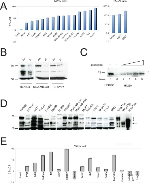 The Trp73 gene belongs to the p53 family of transcription factors and, like the other members, is transcribed into different isoforms [1-4]. TP73 gene contains two promoters, encoding the transcriptional domain-containing (TAp73) and the amino deleted (ΔNp73) isoforms [5, 6]. Furthermore alternative splicing at the 3'-end (to generate α, β, γ, etc isoforms) and 5'-end (to generate Δ2, Δ3 and Δ2-3 isoforms) results in generation of at least 14 different transcripts, with different abilities to promote or repress apoptosis [7, 8]. DNA damaging agents induce TAp73 and activate p73-dependent gene expression program to promote cell cycle arrest and apoptosis. Interestingly, ΔNp73 can counteract these activities, either by directly binding and inhibiting transcription or by competing for DNA binding sites [9-13]. This suggests that the overall activity of p73 stems from the relative expression level of each isoform, rather than the independent activities of single isoforms. The relative expression level is maintained both at transcriptional level and post-translational level. While p73 levels are regulated via acetylation, phosphorylation, interaction with PML, caspase cleavage and degradation by the ubiquitin ligase ITCH [14-19], ΔNp73 isoforms are selectively degraded by the E3 ubiquitin ligase PIR2 or via the antizyme pathway [20, 21]. Although experimental evidence and epidemiological studies point to a role of p73 in cancer [22-24], clear, unbiased data are only very recent [25, 26]. Direct mutations of p73 in tumours are rare, but several studies have revealed a clear tendency towards upregulation of ΔNp73 isoforms and methylation dependent silencing of TAp73, resulting in an imbalance of TA/ΔN ratio. Furthermore, recently developed isoform specific knockout mice have shown that depletion of TAp73 predisposes to cancer, while absence of ΔNp73 impairs tumour growth in transplant assays [25, 26]. For these reasons, we sought to investigate the expression of p73 N-terminal isoforms in a panel of cell lines and mouse tissues. First, we used N-terminal selective primers to analyse the expression of TAp73 and ΔNp73 by qPCR in several cancer cell lines (Figure 1A). Surprisingly, we found consistently higher expression of TAp73 isoforms in the selected cell lines, with the exception of the T-cell leukemia Jurkat cells, where TAp73 and ΔNp73 wereequally expressed. It is noteworthy that in some cell lines like MCF7, COS7 and SW480 we found an impressive imbalance between the two isoforms with up to 100 fold higher TAp73 levels. Next, to validate qPCR data, we investigated protein expression in some of the previous cell lines. To this aim, we used a previously described pan-p73 antibody [27] and utilized p73 siRNA and overexpression of p73 isoforms as controls. Importantly, protein expression levels paralleled mRNA data. Indeed, TAp73α was the most abundant endogenous isoform detected in cells. As shown in Fig 1B/C/D, in most of the cell lines, we detected a 75kDa band that co-migrated with TAp73α positive control and was efficiently silenced by siRNA. Moreover, etoposide treatment in H1299 cell line led to the up-regulation of the 75kDa band (Figure1C), further substantiating efficient detection of TAp73 by the aforementioned antibody. In addition, we analysed p73 N-terminal isoforms expression in mouse tissues. Interestingly, analysis of TA/ΔN ratio, confirmed higher TAp73 expression in-vivo in many organs (Figure 1E). In fact, higher relative levels (>10 fold) of TAp73 mRNA were found in spleen, fat, kidney and bladder, while intermediate levels (<10 fold) were detected in liver, lung and gut. On the other hand, ΔNp73 was the main isoform detected in uterus, salivary gland and tongue. Finally, comparable levels of TA and ΔNp73 mRNAs were expressed in skin, brain, colon and ovary. In summary, we carried out an extensive study of p73 N-terminal isoforms expression both in human cancer cell lines and mouse tissues. Surprisingly, our data showed that transcriptionally competent TA isoforms were detectable at higher levels in most of the cell lines and tissues that were analysed. This is counterintuitive considering the current knowledge on p73, especially in cancer samples, as one would expect increased ΔNp73 expression to be a hallmark of cancer. Also this raises the question about the role of TAp73 in these cells and how its anti-proliferative functions are dealt with. Finally, data on N-terminal p73 isoform expression in primary tumours would be highly beneficial, as this would avoid any bias from prolonged in vitro culture.