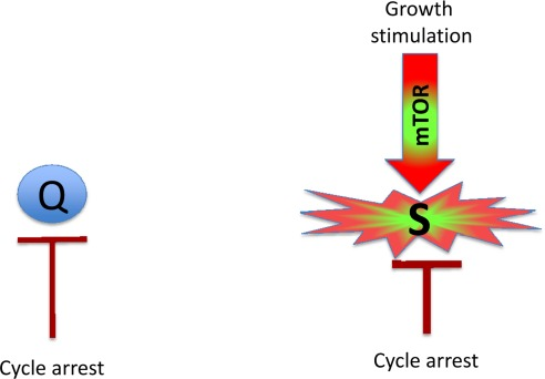 Although loss of RP is very useful marker of senescence in cell culture, this marker may not play a key role in age-related pathologies in the organism, because most post-mitotic cells should not be able to restart proliferation anyway. (Notable exceptions are stem, wound-healing and satellite cells). I suggest that active mTOR_in arrested cells is a crucial marker of gerogenic cells and early senescence. Gerogenic (senescent) and quiescent cells can be distinguished by the levels of phosphorylated S6 (pS6), the ribosomal protein that is phosphorylated in response to mTOR activation: high in senescent cells and low in quiescent cells. Levels of pS6 in senescent cells may remain similar to the levels of pS6 in proliferating cells. So senescent/gerogenic cells have many features of proliferating cells. Interestingly, basal (fasting) levels pS6 were elevated in old mice [85]. Gerogenic cells could be defined as arrested cell with activated mTOR. The most physiologically relevant features are hypertrophy, hyperfunction and feedback resistance.