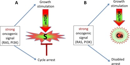 Activation of growth factor receptors, Ras and Raf family members and members of the MAPK and PI3K/Akt pathways are universal in cancer [36-38]. All these oncogenes activate the mTOR pathway [39-47]. They are gerogenic oncogenes, which drive the geroconversion of arrested cells. Because strong growth-promoting (mitogenic) signals induce cell cycle arrest [48-54], strong mitogenic signaling causes both conditions of senescence: arrest and mTOR/growth signal (Figure 2A). To avoid senescence, cancer cells must disable cell cycle control (Figure 2B) by either loss of p16, p53 and Rb or activation of c-myc, for example [36-38, 48, 55, 56]. In proliferating cells, gerogenic oncogenes render cells malignant and pro-gerogenic (see below). The same gerogenic oncogenes or their analogs accelerate aging and shorten life span in diverse species from worm to mammals. Therefore, these genes can be termed gerogenes [57]. Thus, the mTOR pathway shortens life span, whereas rapamycin extends life span [58-75]. Not coincidentally, Mutations that increase the life span of C. elegans inhibit tumor growth [76]. Finally, metabolic self-destruction, known as chronological senescence in yeast [60, 61, 77] is also stimulated by gerogenes and is inhibited by rapamycin [78].