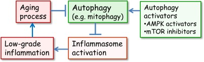 Caloric restriction (CR) is the most common anti-aging intervention which can extend lifespan in organisms ranging from yeast to humans [81]. CR is a potent physiological activator of autophagy [82,83]. Several studies have demonstrated that autophagy is required for the CR-mediated lifespan extension [71,83]. Colman et al. [84] revealed that CR delayed the onset of many age-related pathologies, e.g. incidence of diabetes, cancer, cardiovascular disease and brain atrophy, as well as reducing the mortality of rhesus monkeys. Moreover, it is known that CR effectively protects against inflammatory responses and can combat age-related pro-inflammatory phenotype [85,86]. CR has also several beneficial effects on mitochondrial quality control, e.g. ROS production [87,88], which can improve cellular housekeeping and prevent inflammasomal activation. Many studies have indicated that mitochondrial quality control has a key role in the regulation of the aging process [89,90]. For instance, Trifunovic et al. [91] demonstrated that triggering of point mutations and deletions into mtDNA induced a premature aging phenotype in mice.