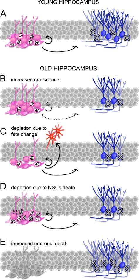 Since the original observation of Altman and Das [19], several studies have consistently confirmed a major reduction in the abundance of proliferating NSCs during aging from rodents to primates [20, 21, 39]. In most studies, BrdU labeling, eventually in combination with markers of cycling cells, e.g.: Ki67 or PCNA, was commonly used to quantify the amount of cells undergoing cell cycle progression. Probably as a result of decreased proliferation, aging was shown to correlate with a decrease in newly generated neurons [20, 21, 39].Regarding NSCs, an important question remains as to whether the decrease in the number of proliferating cells reflects an increase in quiescence as opposed to their depletion. Moreover, an increase in the proportion of quiescent NSCs could be due to a higher number of cells leaving the cell cycle to become quiescent and/or a lower number of quiescent cells entering the cell cycle. Similarly, depletion of NSCs may be due to an increase in differentiation with concomitant loss of self-renewal and/or increased cell death (Figure 1). Discriminating between these possibilities becomes particularly important for studies aimed at compensating the age-related decline in neurogenesis though manipulations of endogenous NSCs either by controlling their cell cycle entry versus exit or, alternatively, by manipulating their cell fate change versus survival.