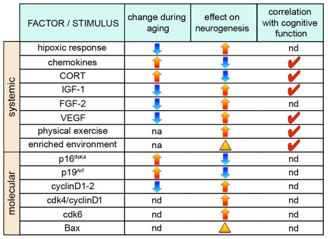 Contrary to CORT, the three growth factors IGF-1, FGF-2 and VEGF were shown to have very similar effects in increasing NSCs proliferation. Expression and/or concentration of these factors and their receptors is known to decrease in the hippocampus during aging [88-91] and, in particular, levels of IGF-1 were shown to be higher, and cognitive performance to be improved, in long-living mutants [92]. A substantial number of experiments were performed to study the effects of the three factors on neurogenesis during adulthood or aging indicating a strong positive effect on NSCs proliferation by IGF-1 [93-95], FGF-2 [96-100], and VEGF [101-104] signaling, with the latter also resulting in improved spatial memory functions [104]. To which extent these or other factors released in the blood can directly influence cognitive function during aging is currently debated [105, 106].