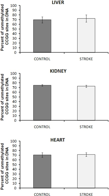 The focal, permanent devascularization (stroke) has been described in detail elsewhere [26]. Figure 1 provides a schematic description of the stroke model used in our study. To test if changes in global DNA methylation wereobserved in liver, kidney and heart tissues of control and stroked animals, we employed the well-established HpaII-based cytosine extension assay. This assay measures the proportion of unmethylated CCGG sites in genomic DNA [8]. We found that all tissues of the control and stroked animals had comparable DNA methylation levels (Figure 2).