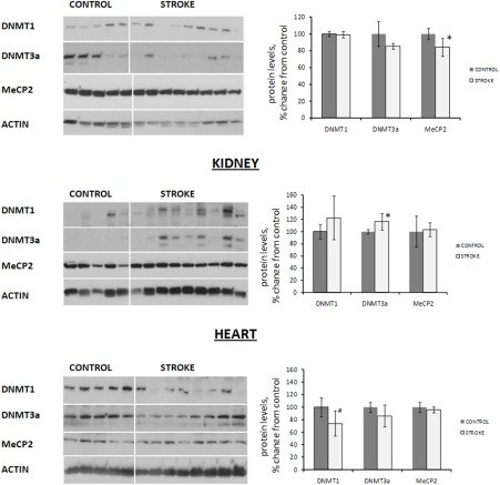 Analysis of the levels of DNMT1 and DNMT3a the liver, kidney, and heart tissues of control and stroked animals revealed interesting and tissue-specific protein expression changes. We noted that DNMT1 levels were subtly (p<0.10) decreased in the heart tissue of stroked animals as compared to controls. In the kidneys of stroked animals, contrarily, the levels of DNMT3a were slightly increased (p<0.05). In the liver tissue of stroked animals, both DNMT1 and DNMT3a levels remained unchanged (Figure 3).