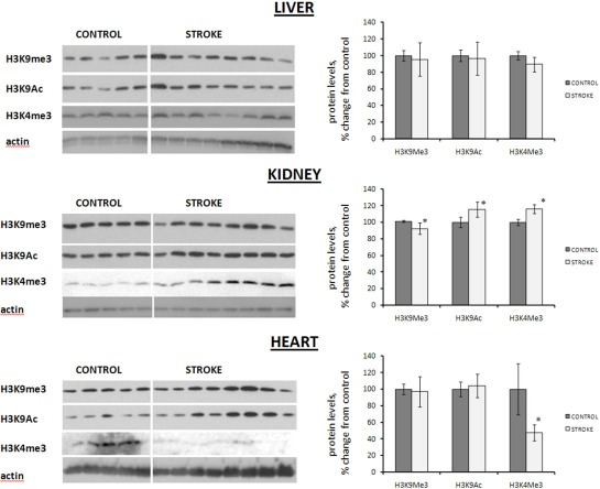 We analyzed the levels of these H3K9 and H3K4 modifications using western immunoblotting. While no changes were seen in the liver, and only one modification occurred in the heart, the changes in the kidney tissues of stroked animals were the most pronounced.