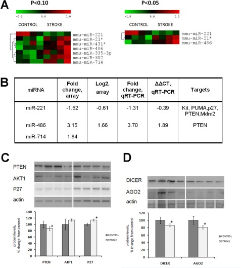 We noted that levels of p27 were significantly elevated in the kidneys of the stroked rats (Figure 5C). Interestingly, we saw a subtle (p<0.10) decrease in the level of PTEN. This protein is targeted by both miR-221 and miR-486, which exhibit opposite expression tendencies: miR-221 is down-regulated and miR-486 is unregulated in the kidney tissue of stroked animals compared with the control ones. Since PTEN is a target of both of these microRNAs, and miR-221 was 1.5-fold down-regulated, and miR-486 was 3.15-fold up-regulated, PTEN expression in the stroked kidneys was slightly down-regulated as compared to the control kidneys.