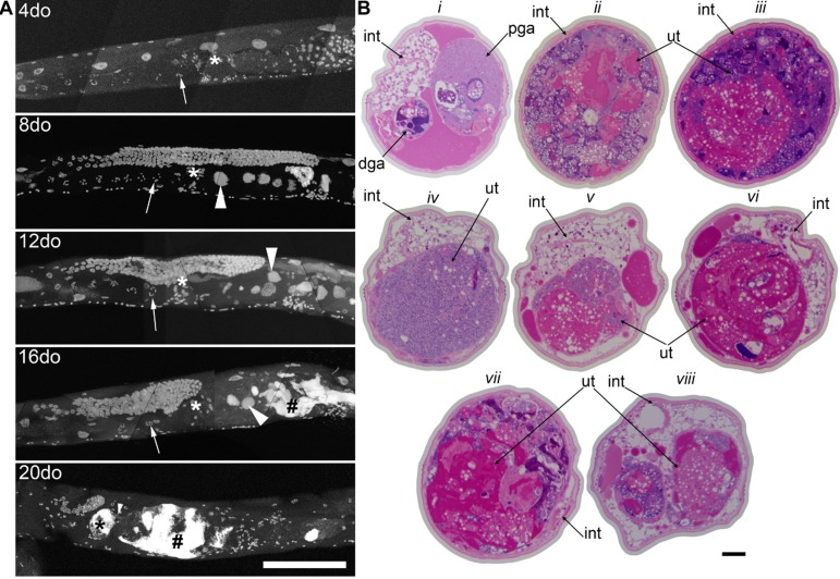 Using imaging techniques in combination with a novel histological methodology for reconstructing aged worms in 3-dimensions, we characterize in detail here for the first time the development of large uterine masses in aging C. elegans which arise from unfertilized oocytes that fail to be expelled from the vulva. Although we and others have commented on early stages of this phenotype [11,16], we report here a more detailed analysis of the progression of the massive age-related uterine growths that swell the uterus and fill most of the diameter of the worm. This advanced age germline phenotype causes other internal organ systems, such as the intestine, to become compressed, which likely has multiple deleterious functional outcomes in worms of advanced age. We observe a high degree of individual variation in the aging germline phenotype, despite animals being raised in identical conditions with an identical genetic background. We also report here for the first time a detailed description of an advanced age Emo phenotype, with uterine masses appearing to be primarily a combination of endoreduplicating oocytes, clusters of cells and/or nuclei, masses of chromatin, and extracellular yolk protein. We report a retardation of age-related uterine growths in the daf-2 insulin-signaling mutant, consistent with prior studies showing reduced germline tumor growth [18] and reduced endomitotic phenotype at older ages [11,16]. Perhaps more significantly, we report that the tumor suppressor cep-1/p53 mutant has a more severe endomitotic phenotype at younger ages than wild-type animals. We also mined a pre-existing whole-genome expression profiling study of aging in C. elegans [19] to show that the transcriptional abundance of cep-1/p53 statistically significantly declines with age. Cep-1/p53 is known to be involved in DNA damage-induced apoptosis in C. elegans [20,21] and there has been some evidence of impaired DNA damage response in older animals [22]. Our data therefore provides evidence for a pathological role for DNA damage in old animals. However, p53 has also been shown to be a regulator of growth via the IGF-1/mTOR pathway [23], and is an important part of the response to genotoxic stress [24,25]. Hence, it is likely that reducing levels of cep-1/p53 with age, results in a complex phenotype including a massive dysplastic growth in the uterus, concomitant with a profound increase in genome copy number, substantially higher than that seen in young C. elegans at the peak of reproductive potential.