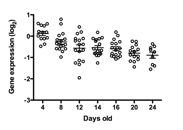 Because C. elegans cep-1 is known to function in DNA damage-induced apoptosis in the germline [37-39] and the mammalian homolog p53 is a well-known tumor-suppressor [40,41], we tested the hypothesis that cep-1 limits the growth of these age-related uterine masses either through it's role in germline apoptosis or in transcriptional regulation of other genes. Indeed, we observed large chromatin masses in the uterus of most cep-1 worms by middle age (12 days of age, Figures 8-9), whereas most wild-type worms do not have similar growths until about 16 days of age (Figure 1A, Movie 1. The age at which these masses can be morphologically visualized in cep-1 mutants is roughly equivalent to when they appear in wild-type (Figure 8). Mating cep-1 hermaphrodites to wild-type males did not appear to delay onset (data not shown), suggesting oocyte defects rather than unviable sperm causes endoreduplication as in middle aged wild-type worms [1,11]. Cep-1 worms have a steady increase in genomic DNA copy number from 3 to 16 days of age (Figure 4, Table 1), whereas wild-type worms maintain relatively steady levels of genomic DNA before a large increase at 16 days of age (Figures 4, Table 1). Cep-1 worms have a significantly higher genome copy number than wild-type worms at 9 (p = 0.01) and 12 (p = 0.002) days of age. Given wild-type animals accumulate uterine masses with age, and loss of cep-1 increases the rate at which these masses appear, we wished to evaluate the transcriptional levels of cep-1 with age to determine if there was any change in cep-1 with increasing age. We had previously reported the largest study on gene expression profiling and aging in any species to date in C. elegans [19], so we mined this pre-existing data set to look at the transcriptional profile of cep-1 in wild-type aging of C. elegans. In our previous study, we noted that there were 5986 genes that were statistically significantly differentially expressed over the lifetime of C. elegans. These genes clustered into seven distinct profiles over lifespan, and cep-1 is in cluster 5 (supplemental Table 8, [19]), and falls steadily in abundance over the life of C. elegans from a peak in young adulthood (Figure 10). Hence, there is a statistically significant decline in the transcript abundance of a key mediator of DNA damage and cell growth with age in C. elegans. To test whether DNA damage-induced apoptosis is important in removing oocytes likely to become uterine masses, we also examined ced-3 mutants for uterine masses, which are incapable of physiological or DNA damage-induced apoptosis [42]. In agreement with previous studies that found loss of ced-3 results in small, low-quality oocytes that will undergo endomitosis [14,15,43]. We observed an early onset of massive uterine growths in ced-3 worms (Figure 11). This indicates that DNA damage may be occurring in these uterine growths and DNA damage-induced apoptosis may be a contributing mechanism to delay these massive uterine growths.
