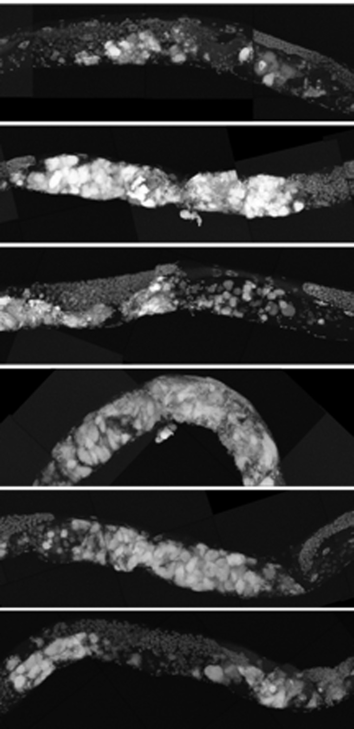 Because long-lived daf-2 worms are resistant to gld-1 driven tumors in young animals [18] and we have previously seen lower genome copy number in old daf-2 worms compared to wild-type [16], we evaluated in greater detail whether age-related uterine growths were delayed in daf-2 animals. The increased resolution of imaging surprisingly showed that at 20 days of age, daf-2 germline masses (Figures 7, Movie 6) are visually very similar to wild-type (Figure 1, Movies 3-5). These masses become less severe with age by both DAPI staining and genome copy number measurements after peaking in severity around 20 days of age (Figures 4, 7, Table 2). Fourty-five-day-old daf-2 worms, well past the maximum life span of wild-type worms, have barely visible uterine masses by DAPI staining (Figure 7), and lower genome copy number measurements (Figure 4, Table 2). The uterus still appears swollen in 45-day-old animals even though DAPI intensity is drastically lowered (Figure 7), suggesting there could be a reduction of DNA in these masses but not an actual decrease in size. Eight-day-old daf-2 worms have a strikingly elevated genome copy number(51,068, n = 10, +/− 8,123 S.E.M.) compared to 9-day-old wild-type animals, representing an almost 3-fold increase in genome copy number over wild-type levels, followed by a significant decrease at 32 (16,610, n = 10 +/− 2172 S.E.M., p=0.0007) and 45 (9,427 +/− 1,707 S.E.M., p=0.02) days of age. At 60 days of age the variance of genome copy number increases (p = 0.0001), and there may be some reoccurrence of endoreduplication at the end of life in the daf-2 longevity mutant. Average genome copy number increases slightly, but not significantly between 45 and 60 days of age (24,090, n = 10, +/− 7,849 S.E.M., p=0.08). The substantial increase in genome copy number in daf-2 animals at a young age is particularly unexpected, as it is known that this strain of daf-2 is less fertile than N2 [36]. The origin of these extra genome copies in daf-2 animals warrants further investigation, as it is either due to reduced oocyte quality, resulting in an early endomitotic phenotype not detectable by our methodology (DAPI staining or serial sectioning/3D reconstruction), or is somatic in origin.