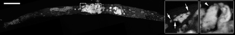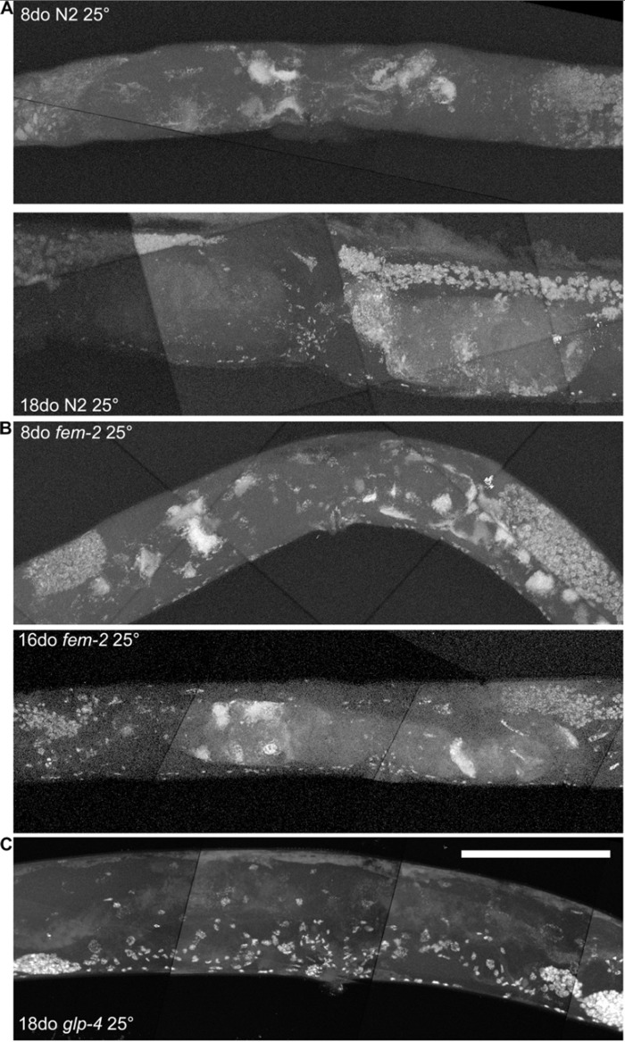 By using a combination of novel imaging techniques (Figure 1, Movies 1-5), we have refined the spatial position of the midbody DNA masses we previously reported [16] primarily to the uterus, through virtue of being able to analyze the animal in detail in 3-dimensions. The masses begin to grow as early as 8 days of age (Figures 1A-B, Movie 1). This is consistent with the approximate age C. elegans deplete their sperm [10,26] and oocyte quality declines such that fertility can only be extended a few days by mating [1,11,12]. Once oocytes fail to be fertilized in the spermatheca, they bypass diakinesis arrest [6] and begin endoreduplicating to swell the uterus by 16 days of age (Figures 1A, Movie S1). The DNA masses are sometimes pushed into the continuous spermatheca and proximal gonad arm from the uterus (Figure 1A), similar to tumors that arise in young adult glp-1 mutants [27,28]. Large age-related uterine growths can sometimes rupture regions of the uterine wall, causing them to enter the pseudocoelom(data not shown). Aged wild-type worms raised at elevated temperature have generally less severe uterine masses by DAPI staining than those raised at normal temperatures (Figure 2), but the masses also generally become visible at earlier ages, compared to worms raised at standard temperature (20°C). Further, these small masses are more often seen in the distal and proximal gonad arm rather than in the uterus (data not shown). We also observed uterine growths by DAPI staining in aged animals grown in sterile conditions, using axenic culture methods (Figure 3). Therefore, the growth of these uterine masses is not caused solely by bacterial infection. The reduced severity of uterine masses does not mean bacteria contribute to growth of uterine masses, since axenic growth conditions also cause slow growth. We observed no masses, even at advanced ages, in glp-4 mutants that do not develop a full gonad (Figure 2C). We did observe germline masses in old, sperm-deficient fem-2 worms similar to old wild-type worms (Figure 2A-B), and we previously demonstrated that no masses form in males [16]. This is also consistent with previous studies that reported an Emo phenotype in young worms devoid of sperm [10,17].