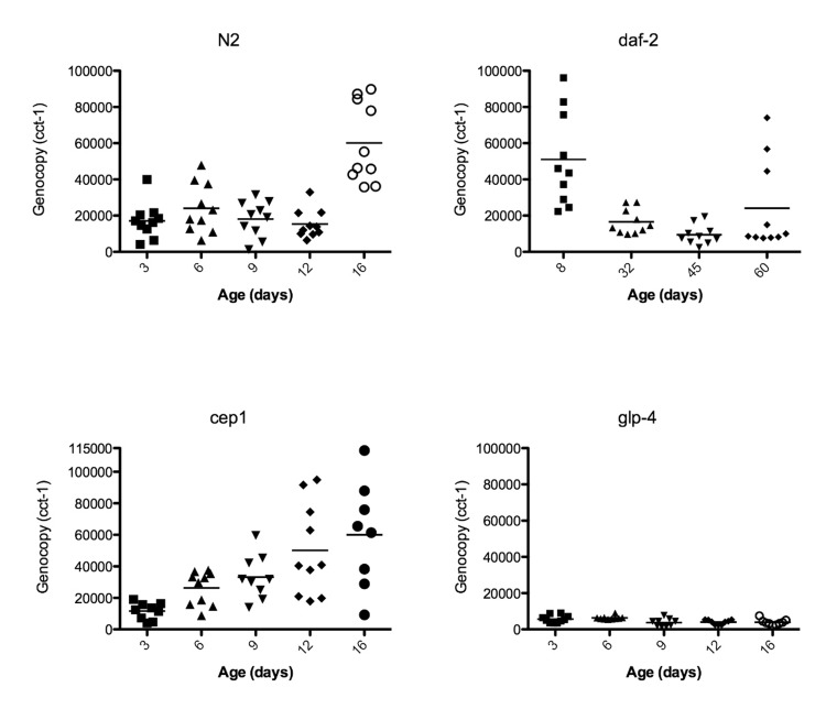 Individual worms for genome copy number experiments were frozen in water and lysed in Proteinase K as described [16]. Digital PCR was performed on the lysate of individual animals using primers corresponding to the genomic DNA of the cct-1 gene (5'-aatacggttgtgtttcaggtaatg-3' and 5'-taccggtgagggcaa gaat-3'). Digital PCR of ced-7 and fat-3 genes yielded similar results to cct-1 (data not shown). Digital PCR signal was measured using UPL probe #78 (Roche) on a Biomark microfluidic system in 12.765 digital arrays (Fluidigm).