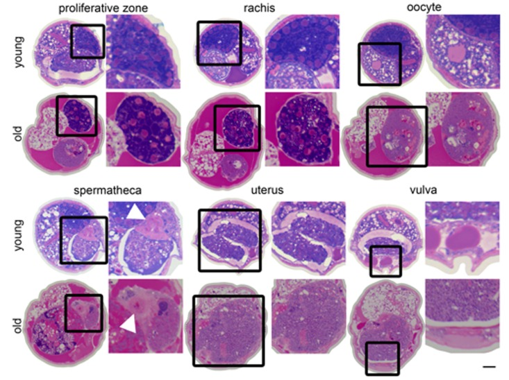 In mid-life (approximately 8-12 days of age), concurrent with sperm depletion, is a decrease in oocyte quality that also prevents the development of viable embryos even in the presence of viable sperm [11,12]. This decrease in oocyte quality with age functions at least partially through the insulin signaling and TGF-β pathways from the somatic gonad. Low quality oocytes can have various defects including small size, apparent cavities, increased aneuploidy, or cluster together in the uterus [11,13]. The apoptotic pathway is also required to maintain oocyte quality, as a loss of apoptosis in the germline causes an early loss of reproductive capacity and an earlier incidence of abnormal oocytes [14,15]. This decline in oocyte quality is also accompanied by a substantive increase in genome copy number, which is due to proliferation of the genome in the germline with age [16].