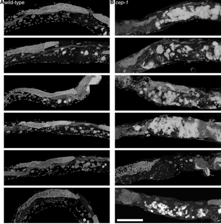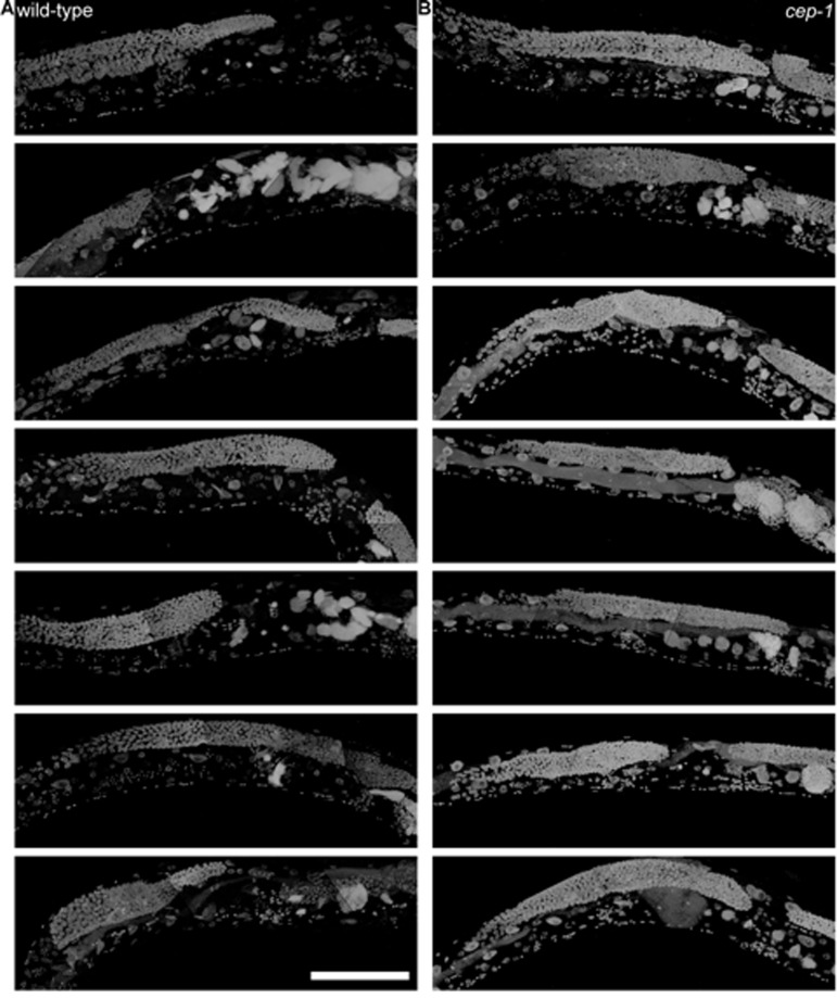 C. elegans strains were cultured using standard conditions [22] (N2, cep-1(gk138)I, daf-2(e1370)III, ced-3(n717)IV) or at the restrictive temperature of 25 degrees (glp-4(bn2)I,fem-2(b245)III) and obtained from the Caenorhabditis Genetics Center. Synchronized populations were acquired by allowing adult parents to lay eggs for 2-4 h before removing them (day 0). Worms were transferred daily to fresh plates during the reproductive period. Confocal microscopy, staining of tissue sections, and 3-D visualization was performed as described [30].