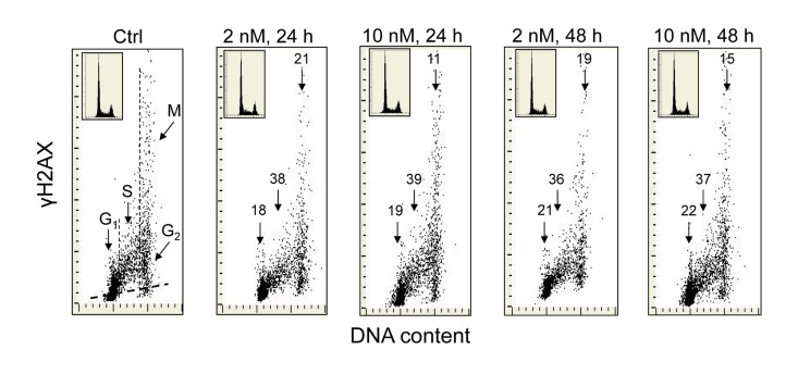 Exposure of A549 cells to 1,25-VD at a concentration of 2 or 10 nM for 24 and 48 h led to a distinct reduction in the level of expression of γH2AX (Figure 1). As it is evident from the bivariate DNA content versus γH2AX expression dotplots, the degree of decline in γH2AX expression was similar regardless of 1,25-VD concentration and duration of cell treatment. However, a distinct difference was apparent with regard to cell cycle phase. The cells most affected were in S-phase of the cell cycle which showed a reduction in γH2AX within the range of 36% to 39%. The effect of 1,25D was less pronounced in the case of G1 or G2M phase cells as their γH2AX expression was decreased by only 18-22% or 11-21%, respectively. During the time and at the concentration of 1,25-VD studied here, there was no detectable effect on the cell cycle distribution of A549 cells, as is evident from the similarity of the cellular DNA content histograms shown in the respective insets.