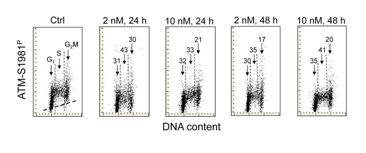 Figure 2 illustrates the effect of 1,25-VD on the level of phosphorylation of ATM at S1981 in A549 cells. As in the case of H2AX phosphorylation (Figure 1), the expression of S1981 phosphorylated ATM was markedly reduced in cells exposed to 1,25-VD. The degree of decline in expression of phosphorylated ATM was similar at 2 nM and at 10 nM of vitamin D and following 24 h or 48 h of exposure. As compared with the effect of 1,25-VD on γH2AX expression (Figure 1) there were less pronounced differences in the degree of reduction of ATM-S1981P between the cells in different phases of the cell cycle. However, the cells in S phase were somewhat more affected (33% - 43% reduction) compared to G1 (30-35%) or G2M cells (17-30%), respectively.