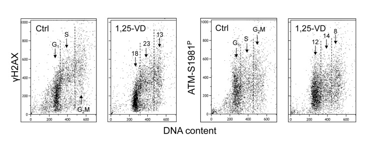 We have also tested the effect of 1,25-VD on the level of constitutive expression of γH2AX and ATM-S1091P in proliferating human lymphocytes (Figure 4). In the initial experiments we noticed that when 1,25-VD was added into cultures concurrent with PHA, lymphocyte stimulation, as expressed by the increases in cellular RNA content and progression through the cell cycle, was delayed compared to cells growing in the absence of 1,25-VD. This observation was consistent with prior studies that showed the suppressive effect of 1,25-VD on lymphocyte stimulation by a variety of mitogens [41-43]. However, when lymphocytes were already fully in the cell cycle 48 h following stimulation by PHA, the treatment with 1,25-VD did not alter their cell cycle progression over the subsequent 24 h. Under such conditions, we were able to test the effect of 1,25-VD on constitutive expression of γH2AX and ATM-S1981P on cells which had fully entered the cell cycle similar to the cells stimulated by PHA growing in the absence of 1,25-VD (Figure 4A). Therefore, the results were not biased by the anti-proliferative effect of 1,25D which would have been apparent if 1,25-VD had been added earlier during lymphocytes stimulation by PHA.