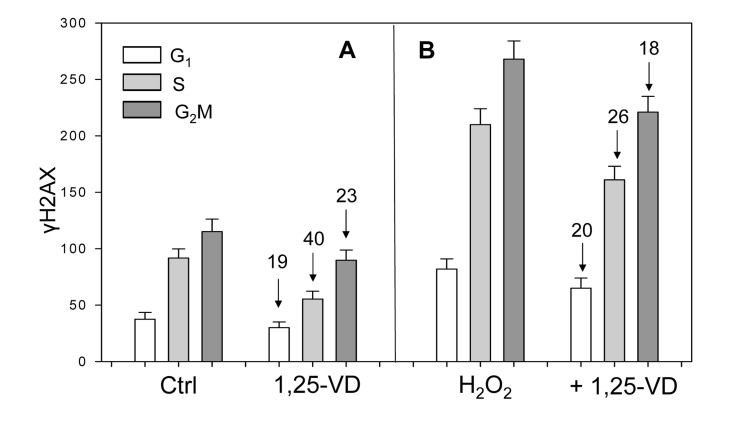 In another set of lymphocyte cultures, we explored whether 1,25-VD can affect expression of γH2AX upon induction of oxidative damage by H2O2. Towards this end, lymphocytes stimulated by PHA for 48 h and then treated with 1,25-VD for an additional 24 h were exposed to 200 μM H2O2 (+ 1,25-VD) for 60 min; parallel cultures of PHA stimulated lymphocytes were exposed to 200 μM H2O2 for 60 min without pretreatment with 1,25-VD (H2O2) (Figure 4B). The cells treated only with H2O2 had approximately a two-fold higher level of γH2AX expression compared with the untreated cells (Ctrl), consistent with the induction of oxidative DNA damage by the peroxide [40]. However, the effect of treatment with H2O2 in terms of a decline in expression of γH2AX was less pronounced in the cells exposed to 1,25-VD. Specifically, compared with the cells not treated with 1,25-VD, the treated cells exhibited an 18-26% lower level of γH2AX expression in which the S phase cells were more affected compared to G1 or G2M phase cells.