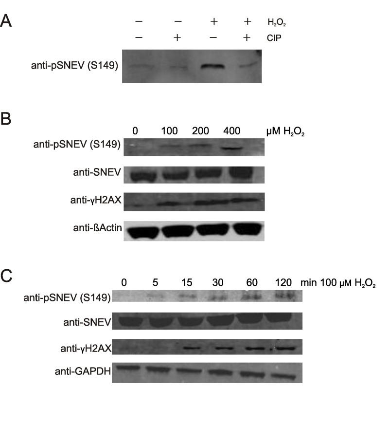 Based on these results, we were curious to confirm our assumption that SNEV phosphorylation was stimulated by DNA damage in normal cells. Human diploid fibroblasts (HDF5) were exposed to different concentrations of hydrogen peroxide for 1 hour or to 100μM hydrogen peroxide for different times. Total cell lysates were subjected to Western Blot analysis with anti-pSNEV(S149). Indeed, phosphorylation of SNEV was triggered by oxidative stress in a time- and dose-dependent manner (Fig. 2B and C). Phosphorylation was observed as quickly as after 5 minutes of hydrogen peroxide treatment and reached a maximum after 1 hour. To verify that hydrogen peroxide treatment indeed induced the formation of DNA double strand breaks (DSB), we examined the ATM dependent phosphorylation of γH2AX, which occurs in response to DSB [7], and showed a similar kinetic as phosphorylation of SNEV(Fig. 2B and C).