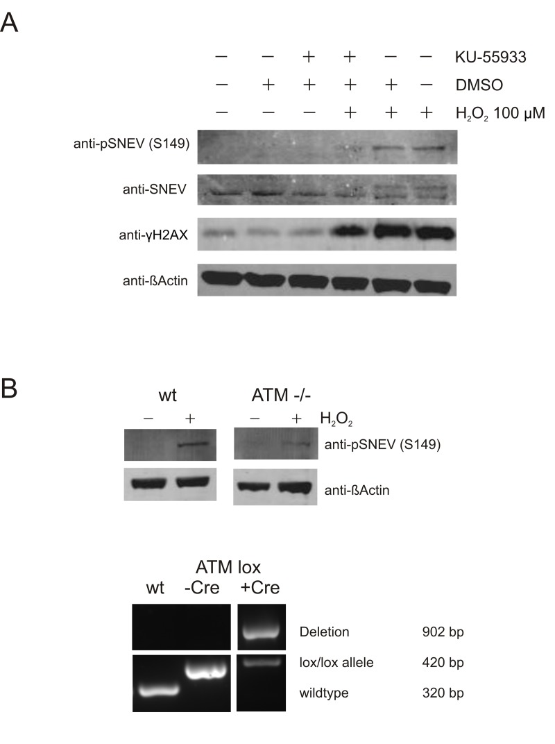 To confirm that ATM controls SNEV S149 phosphorylation with an independent method, we used mouse embryonic fibroblasts in which ATM was flanked by loxP sites and cut out using Cre recombinase (ATM -/- MEF). As shown in fig. 4B, the induction of pSNEV(S149) upon hydrogen peroxide treatment was reduced to less than half of that observed in wildtype MEF (pSNEV band intensity 0.16 versus 0.38 arbitrary units, normalized to βActin intensity; data not shown). The lower panel in fig. 4B shows an agarose gel of the genotyping PCR. Using a combination of three primers, three different fragments are amplified according which cells can be genotyped. The 320 bp fragment indicating absence of loxP sites is amplified only in wildtype cells, whereas presence of loxP sites gives rise to a 420 bp fragment. Only after introduction of Cre recombinase is ATM cut out and a fragment of 920 bp is amplified. Since the 420 bp fragment is still present inspite of Cre transfection, there is still residual ATM activity in our ATM -/- MEF, which explains why we still detect some pSNEV in these cells, although to a lesser extent then in wt MEF.