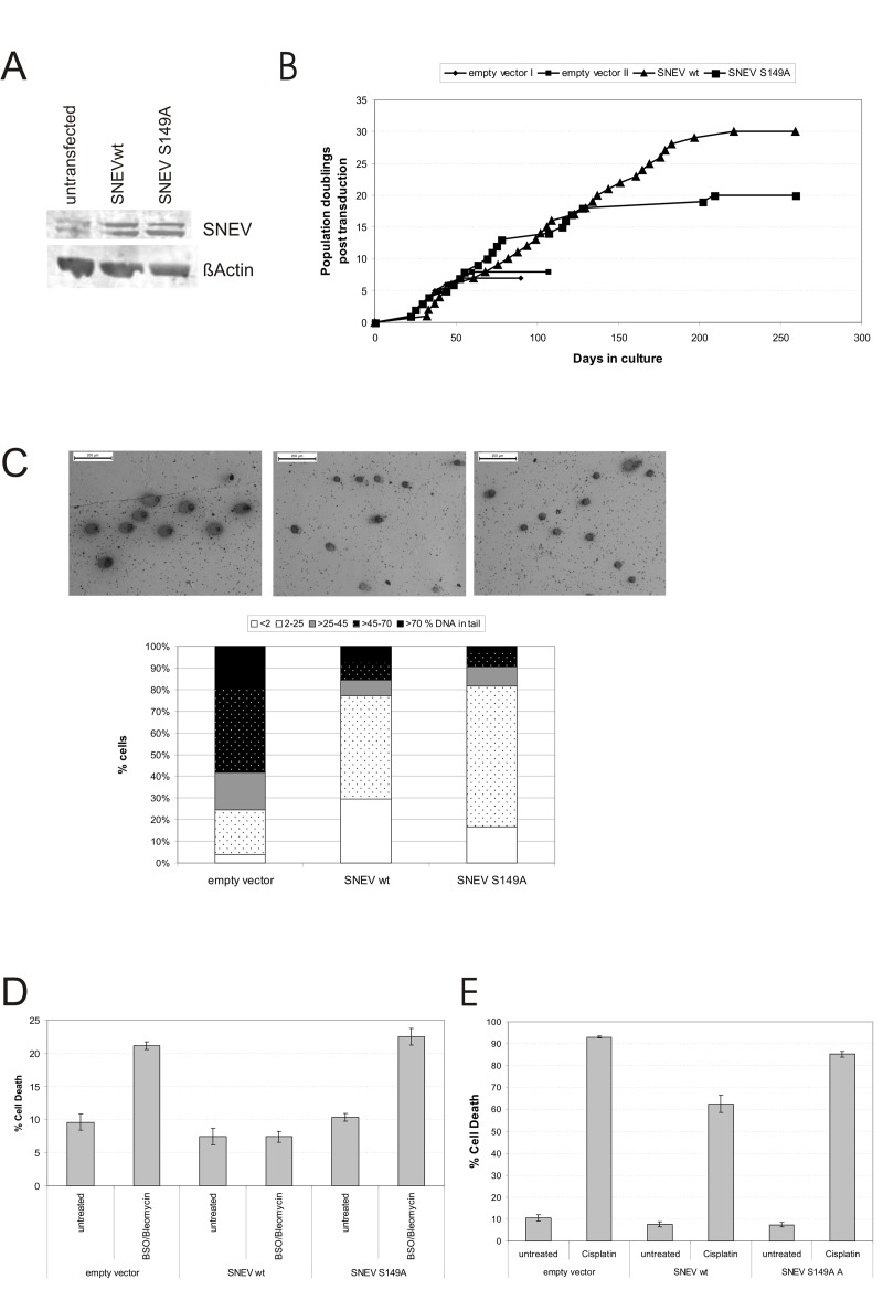 In summary, we conclude that overexpression of S149-phosphorylation incompetent SNEV does have a small but discernible effect on the DNA damage status under normal culture conditions when compared to wtSNEV overexpression, but does not exert the strong anti-apoptotic effect of wtSNEV after induction of DNA damage by either oxidative stress or interstrans crosslinks.
