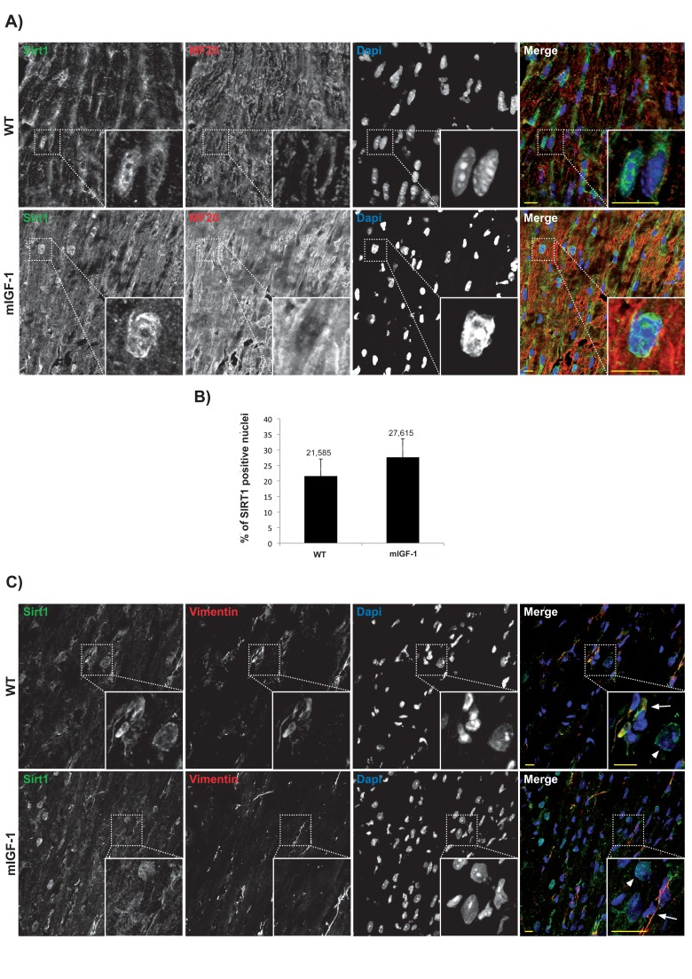 Subcellular localization of chromatin remodeling SIRT1 varies in different cell types, and it is crucial for its impact on cellular functions. Previous reports based mainly on biochemical fractionation techniques indicated that SIRT1 is localized in the cytoplasm of cardiomyocytes in basal conditions, and nucleo-cytoplasmic shuttling is a regulatory mechanism of SIRT1 that may participate in the stress response [21, 22]. While the cardiomyocytes constitute the bulk of heart mass, this organ is composed only for ~60% of this cell type, and fibroblasts and other cell types (endothelial cells, macrophages, stem cells) account for the remaining fraction [23]. A bidirectional cross-talk between cardiomyocytes and non-cardiac cells is crucial to respond to pathological stimuli [23], and SIRT1-dependent metabolic effects may be cell- and compartment specific. To date, a quantitative microscopy-based approach to elucidate cell-specific SIRT1 localization in the heart has not been undertaken. Aiming to this, we first evaluated SIRT1 localization in the cardiomyocytes. Confocal analyses of heart cryo-sections from unstimulated 3 months old wild type (WT) and mIGF-1 transgenic (Tg) mice were performed. Sections were co-stained with SIRT1 (Fig.1 Panel A and C, green), and a specific marker of cardiomyocyte sarcomeric myosin (MF-20, Fig.1 Panel A and C, red), and DAPI counterstaining was used for the nuclei (Fig.1 Panel A and C, blue). Software-assisted analysis showed that SIRT1 was localized in ~22 % of the cardiomyocytes nuclei in WT mice and in ~28 % of the cardiomyocytes nuclei in mIGF-1 Tg mice (Fig. 1A and B). Co-staining for SIRT1 and vimentin (class III intermediate filament, marker of fibroblasts and mesenchymal like cells) revealed an exclusive cytoplasmic co-localization of SIRT1 in these non cardiac cells both in WT and mIGF-1 mice (Fig. 1, Panel C). Typically, larger SIRT1 positive nuclei in vimentin negative cells (Fig. 1 Panel C, arrowheads), presumably belonging to cardiomyocytes, were found adjacent to vimentin positive cells (Fig. 1 Panel C, arrows). SIRT1 was found exclusively in the cytoplasm also in endothelial cells, as determined by co-localization with CD144 (vascular endothelial-cadherin) (data not shown). These findings suggest that, in the heart of both WT and mIGF-1 mice, SIRT1 localizes in the nucleus of a substantial fraction of cardiomyocytes, whereas it is only cytoplasmic in non cardiac cell types.