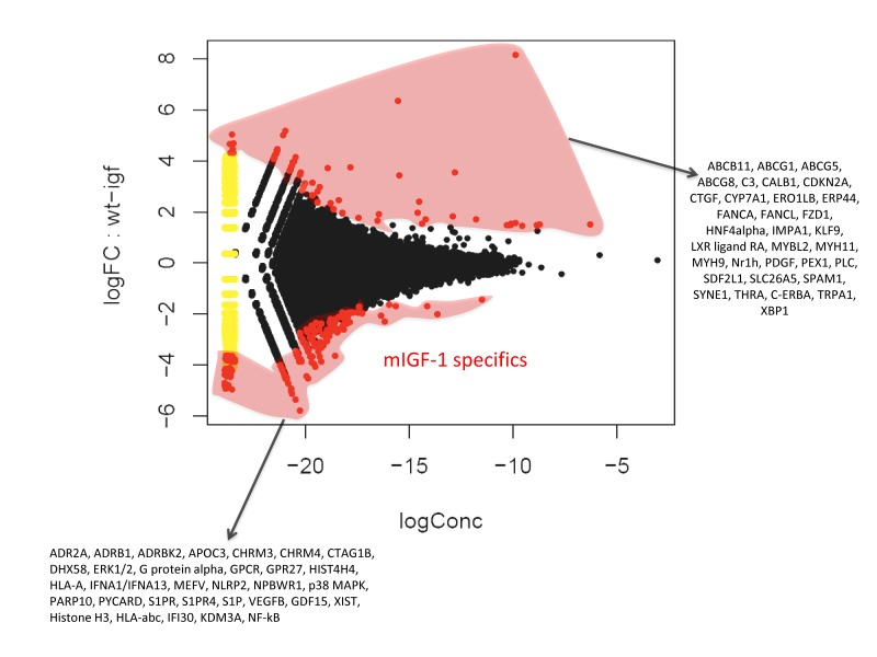 Data segmentation and filtering: Data segmentation was done, chromosome by chromosome using BayesPeak algorithm [46], implemented in the Bioconductor package BayesPeak. As background the Mock sample was used. Peaks selection was done using thresholds based on the posterior probability generated by the software, PP≥0.5, subsequently only the peaks overlapping in replicated experiment were considered. This approach yielded 5347 WT peaks and 9467 IGF1 peaks that were merged.