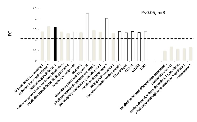 In addition to genome-wide cardiac binding pattern of SIRT1, we sought to determine differences in the transcriptional profiling induced by mIGF-1 transgene in the mouse heart. Previous transcriptomic analyses in the heart of mIGF-1 Tg versus WT mice 24 hours after oxidative injury induced specifically by cardiotoxin injection revealed increased levels of the mitochondrial protein UCP1 (uncoupling protein 1), adiponectin and the antioxidant metallothionein 2 [9]. These three proteins are involved in cardiac protection from oxidative stress, and in isolated cardiomyocytes the upregulation of their levels by mIGF-1 transgene was dependent on SIRT1 activity [5, 9]. Basal transcriptomic analysis on the heart of mIGF-1 Tg versus WT mice in absence of any injury has not been performed and could help to explain why the cardiomyocytes of these mice respond better to specific types of stress (ischemia, angiotensin II, cardiotoxin injection, paraquat injection), with consequent re-generation of the heart tissue [6, 9, 10]. To this purpose, RNA from WT and mIGF-1 Tg hearts was processed for Affymetrix GeneChip analysis. Interestingly, we found that only 22 genes showed a >30% change in mRNA levels (17 upregulated and 5 downregulated, respectively, p<0.05) in the hearts of mIGF-1 Tg mice compared to WT littermates (Fig. 3). Transcript for IGF-1 was found upregulated as expected (Fig. 3, black bar). Most of the upregulated genes in mIGF-1 Tg hearts, 8 out of 17, pertain to the regulation of immune function: lymphocyte antigene 86 (a protein playing an important role in Toll-like receptor 4 pathway), chemokine (C-X-C motif) ligand 14 (a chemoattractant targeting tissue macrophages), C3 (complement component 3, protein whose activation is required for both classical and alternative complement activation pathways, whose promoter is bound by SIRT1, see above), lipopolysaccaride binding protein, CD53 antigen (a tetraspanin protein of the lymphoid-myeloid lineage), CCL21A/CCL21B (potent chemoattractants for lymphocytes) and CCR2 (receptor for monocyte chemoattractant protein-1, MCP-1) (Fig. 3, open bars). The upregulation of these 8 genes was confirmed by qRT-PCR (Fig. 4B) and indicates that cardiac restricted mIGF-1 transgene, in absence of stress, could activate yet uncharacterized immune cell types and mechanisms.