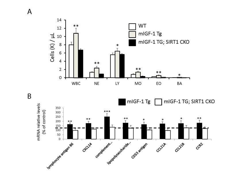 We report thus that at the basal state mIGF-1/SIRT1 genomic and transcriptomic effects in mouse cardiomyocytes are not only related to cardioprotection and anti-oxidant defenses observed under stress conditions [5, 6, 9]. Instead, comparison of both ChIP-Seq data for SIRT1 genome binding and transcriptomic data between WT and mIGF-1 Tg hearts revealed unexpected targets that point to regulatory functions of the mIGF-1/SIRT1 signaling beyond cardiomyocyte specific mechanisms. This led us to perform a more in depth phenotyping and behavioral analysis of these mice, looking closer at three major body compartments involved in stress and aging: the immune system, the arterial blood pressure control system and the behavioral responses dependent on the central nervous system.