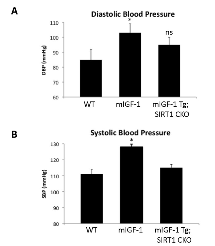 Since ChIP-Seq analysis of SIRT1 genome-wide binding in the mouse heart identified several promoters of genes involved in the immune function, and transcriptomic analysis pointed to an upregulation of 8 key genes implicated in the immune response, we sought to quantify accurately the white blood cell (WBC, leukocytes) number in the peripheral blood of WT and mIGF-1 Tg mice. Blood was collected from WT and mIGF-1 Tg mice through the tail vein and the five different types of leukocytes were measured by hematological profile using the Hemavet blood analyzer. We found that the total count of WBC was significantly increased in the blood of mIGF-1 Tg mice compared to WT mice (Fig. 4A). This total increase in WBC was reflected in a significant increase of all the individual types of leucocytes analyzed (neutrophiles, lymphocytes, monocytes, eosinophiles and basophiles), in terms of thousands of cells per μl (Fig. 4). If values were represented as percentage of cells compared to the total of WBC, mIGF-1 Tg mice displayed 10% less lymphocytes than WT mice, although this difference was not statistically significant (data not shown). To understand if mIGF-1 cardiac transgene induced leukocytosis was dependent on SIRT1 activity, we analyzed the blood of mIGF-1 Tg where SIRT1 activity was specifically ablated in a conditional (αMHC-Cre) and tamoxifen-inducible manner in cardiomyocytes (mIGF-1 Tg; SIRT1 CKO), as we have recently described [6]. This maneuver restored WBC to WT level, indicating that SIRT1 is indispensable for the increase in WBC count observed in cardiac restricted mIGF-1 Tg mice (Fig. 4A). The WBC count of SIRT1 CKO was indistinguishable from WT mice (data not shown). Further, we analyzed by qRT-PCR the cardiac expression of the 8 genes that we found upregulated in Affymetrix analysis in the heart of mIGF-1 Tg mice (lymphocyte antigene 86, CXCL14, C3, CD53 antigen, CCL21A, CCL21B, CCR2) (Fig. 3). A significant upregulation of these genes was confirmed in the heart of mIGF-1 Tg mice compared to WT mice, and it occurred to a similar extent when compared to the one detected by microarrays (Fig. 4B). SIRT1 CKO hearts had similar levels of these transcripts as of WT (data not shown). However, genetic deletion of SIRT1 abrogated the immune gene expression signature observed in mIGF-1 Tg mice (Fig. 4B). These results suggest that SIRT1 is the major transducer whereby mIGF-1 stimulates the expression of immune-related genes in the heart tissue. A raise in total WBC count above the normal range is frequently a sign of an inflammatory response or of a generic stress [25]; moreover, in the elderly leukocytosis has been observed in association to an increased incidence of ischemic cardiovascular events [26]. As stated, mIGF-1 Tg mice are protected from oxidative and hypertrophic stresses and do not display any evident morphological feature of cardiac dysfunction as detected by histology or echocardiography [6, 9]. The latter results, together with the finding that SIRT1 binds promoter of genes involved in cardiovascular function and blood pressure control (ABCG1, C3, CTGF, MYH11, PDGF, TRPA1 in WT hearts; and ADRB1, ERK1/2, G protein alpha, GPCR, p38 MAPK, VEGFB, NF-kB in mIGF-1 Tg hearts) (Fig. 1), prompted us to measure in these animals blood pressure, a direct output of cardiac performance. We non-invasively measured the diastolic and systolic blood pressure (DBP and SBP, respectively) in a cohort of WT, SIRT1 CKO, mIGF-1 Tg and mIGF-1 Tg; SIRT1 CKO using the well-established tail-cuff method. While no difference was observed between WT and SIRT1 CKO mice, these analyses showed a ~20-25% significant increase in both DBP and SBP in mIGF-1 Tg mice compared to WT littermates, in the basal state (Fig. 5). This reproducible increase in diastolic blood pressure (DBP) and systolic blood pressure (SBP) induced by cardiac restricted mIGF-1 transgene could be defined as mild hypertension, as in genetic and dietary murine models of hypertension the values of DBP and/or SBP can reach a 2-fold difference [27]. When blood pressure was analyzed in mIGF-1 Tg; SIRT1 CKO mice, DBP showed a trend of increase compared to WT, although this was not significant and was to a lesser extent when compared to mIGF-1 Tg mice (Fig. 5); SBP on the other hand was found restored to WT level in mIGF-1 Tg; SIRT CKO mice (Fig. 5). These data suggest a mild hypertension in cardiac overexpressing mIGF-1 Tg mice, which could at least in part be rescued by cardiomyocyte-specific inactivation of SIRT1 enzyme.