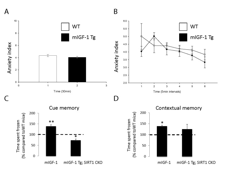 It is well established that the effect of stress on the immune system and arterial blood pressure is reciprocally linked to individual and social behavioral responses (such as fear, anxiety) in animal models and human beings [28-30]. To determine if cardiomyocyte specific mIGF-1 transgene could impact on behavioral stress responses, and to understand the role of downstream SIRT1 in this process, we ran in our mice open field and fear conditioning (FC) tests, to determine anxiety levels and responsiveness to an aversive stimulus, respectively. The open field test is commonly used in mice as a qualitative and quantitative measure of locomotor activity and willingness to explore. When WT were compared to mIGF-1 Tg mice, there was no statistical difference in the emotionality/anxiety index if the animals were observed either at the end of the test (30 min, Fig. 6A) or at 5 minute intervals (Fig. 6B). Therefore mild elevated arterial blood pressure in mIGF-1 Tg mice is not overtly linked to anxious behavior. Next, we performed FC test. FC provides a measure of memory of the association between an aversive stimulus such as a mild foot shock and an environmental input. The environmental input consists in a discrete stimulus, i.e. a tone or the test chamber (context). In the FC test, freezing behavior, which is a characteristic fear response in mice (total lack of movement), provides a read-out of memory. Animals that show good memory freeze upon re-presentation of the context (contextual fear conditioning) or the tone (cued fear conditioning). Aging has been reported to decrease memory to an aversive stimulus (decreased freezing) in context- and cue-dependent fear response [31-34]. FC test on WT and mIGF-1 Tg mice showed that mice harboring mIGF-1 transgene in the heart had a better memory of the aversive stimulus, for both cue and context fear response, in that they spent a significant augmented time in a frozen position compared to WT littermates with both environmental inputs (Fig. 6C and D). We then performed FC test in mIGF-1 Tg mice devoid of SIRT1 in cardiomyocytes (mIGF-1 Tg; SIRT1 CKO): these mice surprisingly had a decreased cue-dependent fear response compared to WT, whereas the context-dependent fear response was not significantly altered (Fig. 6C and D). In conclusion, the overexpression of mIGF-1 transgene in mouse heart impinges on the behavior of the whole animals and ameliorates their memory of an aversive stimulus, assessed as freezing in response to fear, and this occurs in a SIRT1 dependent manner.