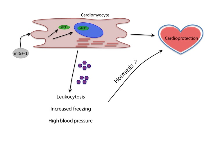 Of note, we found increased mRNA levels of chemokines CCL21A and CCL21B in the heart of mIGF-1 Tg mice. A study from Villeda et al. recently showed that increasing peripheral CCL11 chemokine levels in vivo in young mice impaired memory in the FC test [38]. This was originally implicating a member of the CCL family in the regulation of cognitive functions, and it will be of interest to assess if high circulating levels of CCL21A/CCL21B might play a role in the observed improved cognitive function of mIGF-1 Tg mice. Recent breakthrough data show for the first time that modulation of a single cardiac signaling pathway have profound effects on global energy homeostasis: inhibition of miR-208 in the heart of mice confers resistance to high-fat diet-induced obesity, and improves systemic insulin sensitivity and glucose tolerance [39]. Here we propose that it can also influence globally the immune system, arterial blood pressure and even an ancient behavioral mechanism such as the response to fear. The identity of the circulating factors, such as cytokines and metabolites, and mechanisms mediating the systemic response of cardiac specific mIGF-1/SIRT1 remain to be addressed (Fig. 7). From the point of view of biogerontology, the impact of cardioprotective mIGF-1 pathway on immune and cardiovascular stress is coherent with the concept of hormesis, i.e. exposing cells and organisms to mild stress should result in an adaptive response with various benefits (Fig. 7) [40-42]. We did not perform yet a longitudinal study of life span in mIGF-1 Tg mice to determine if they live longer, although they are functionally as healthy as the wild type and protected against potent oxidative stressors hitting the heart or the whole body [5, 6, 9, 10]. Moreover, the improved memory in remembering an aversive stimulus of mIGF-1 Tg mice is opposite to what is observed in old animals [31-34, 38]. Elucidating in detail the systemic effects of the cardioprotective mIGF-1/SIRT1 pathway may help to develop new cardiac and anti-aging therapies.