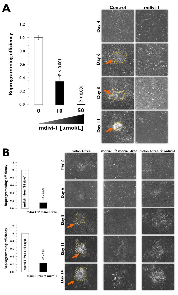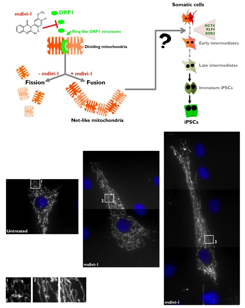 We recently addressed whether mitophagy might play a role in the regulation of induced pluripotency using mdivi-1 (for mitochondrial division inhibitor), a highly efficacious small molecule that selectively inhibits the self-assembly of DRP1 [31-33], a member of the dynamin family of large GTPases that mediates mitochondrial fission [34-36]. We now provide the first experimental evidence that mitochondrial division is integrated into the reprogramming factors-driven transcriptional network that specifies the unique pluripotency of stem cells.