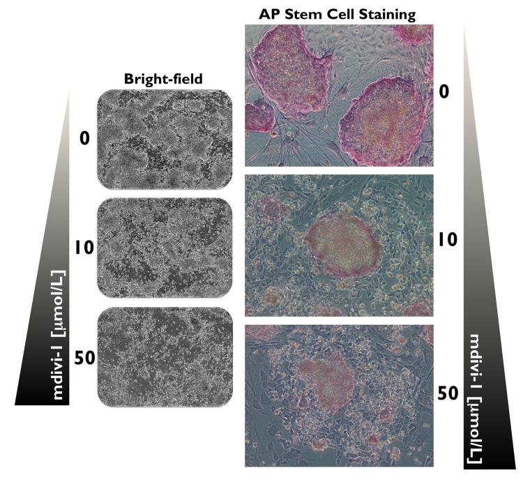 To address the functional effects of a mitochondrial fission deficit imposed by DRP1-GTPase inhibition on iPSC generation, we performed comparison experiments using the three-factor (i.e., OCT4, SOX2, and KLF4) induction protocol in early-passage mouse embryonic fibroblasts (MEFs). MEFs were first transduced with individual lentiviruses containing OCT4, SOX2, and KLF4 at a 1:1:1 ratio on day 0. The transduction was repeated every 12 h for 2 days using the same batch of all three lentiviruses. On day three after the first transduction, the culture medium was switched to human embryonic stem (hES) cell growth medium with or without two different concentrations of mdivi-1. We used mdivi-1 at 10 and 50 μmol/L, the range of mdivi-1 concentrations required to observe either net-like or collapsed/degenerate perinuclear mitochondrial structures [31, Fig. 1, bottom]; the ES medium with or without mdivi-1 was renewed every two days. From days 10-12, clearly recognizable, tightly packed colonies similar to hES cells appeared in the mdivi-1-free control cultures. We then combined the observations of ES cell-like morphological changes (e.g., defined boundaries and high nucleus-to-cytoplasm ratio within individual cells) with alkaline phosphatase (AP) staining, a commonly used pluripotency marker, to quantify bona fide iPSC colonies on day 14 post-viral transduction.