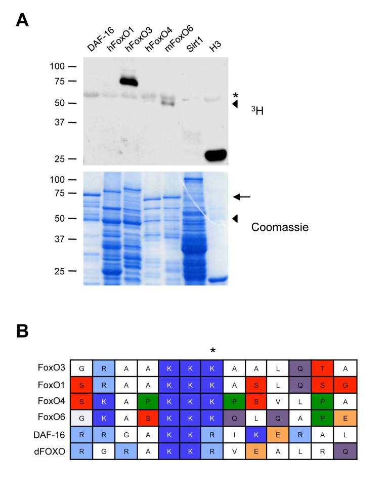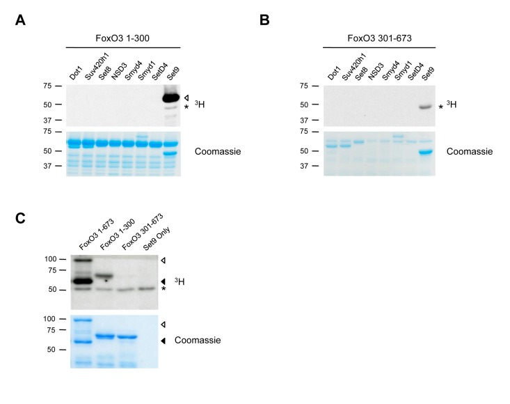 We next asked if Set9 also methylated other mammalian FoxO family members (human FoxO1, human FoxO4, and mouse FoxO6), as well as FoxO orthologs in other species (DAF-16, the worm FoxO). While we do see methylation of other mammalian FoxO family members (most noteably a fragment of mouse FoxO6) as well as worm ortholog DAF-16, surprisingly, FoxO3 was the only protein in the FoxO family that was robustly methylated by Set9 under the conditions used (Fig. 3A).