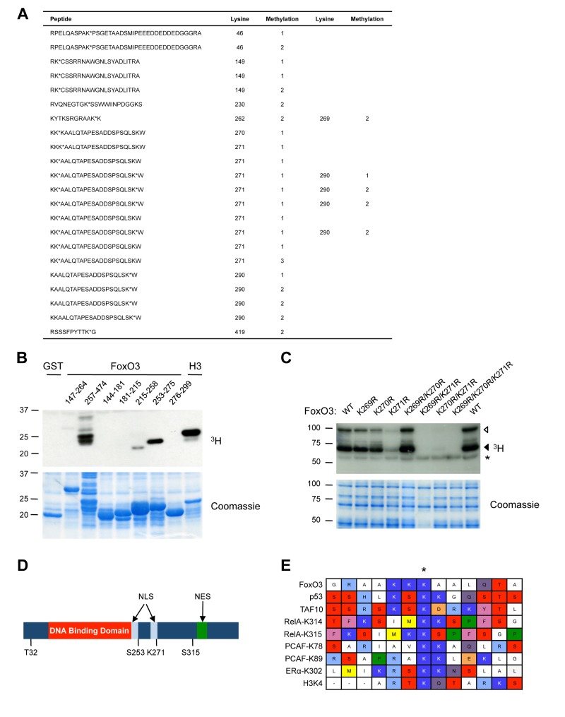 To determine if the amino acids surrounding K271 formed a potential consensus sequence for Set9 methylation, we aligned a 13 amino acid region surrounding this site in FoxO3 with regions of similar length surrounding the Set9-methylated lysine residues in previously identified substrates (Fig. 2E). This alignment did not reveal a clear consensus sequence for Set9 methylated sites, but it suggested that Set9 requires positively charged residues (K or R) in the vicinity of the methylated lysine (Fig. 2E).