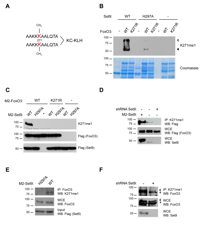 To investigate whether FoxO3 is methylated by Set9 in mammalian cells, we generated an antibody specifically directed to the mono-methylated lysine 271 of FoxO3 (K271me1). As an epitope, we used a branched peptide that contains two mono-methylated epitopes per molecule (Fig. 4A). To test the specificity of this antibody to methylated FoxO3, we performed an in vitro methylation assay with wild type (WT) FoxO3 or the FoxO3 K271R mutant as substrates, and either WT Set9 or a methyltransferase-deficient version of Set9 (H297A) as the enzyme [66]. The K271me1 antibody recognized only WT FoxO3 that was incubated with WT Set9, and did not recognize FoxO3 K271R mutant (Fig. 4B). The K271me1 antibody did not recognize FoxO3 in the presence of the methyltransferase-deficient mutant of Set9, confirming the specificity of this antibody (Fig. 4B). There was a minor signal from a degradation fragment of FoxO3 in the presence of the Set9 methyltransferase-deficient mutant, which might be due to the fact that this mutant is not completely deficient for methyltransferase activity in vitro. Together, these results indicate that the antibody is specific for methylation of K271 on FoxO3 in vitro.