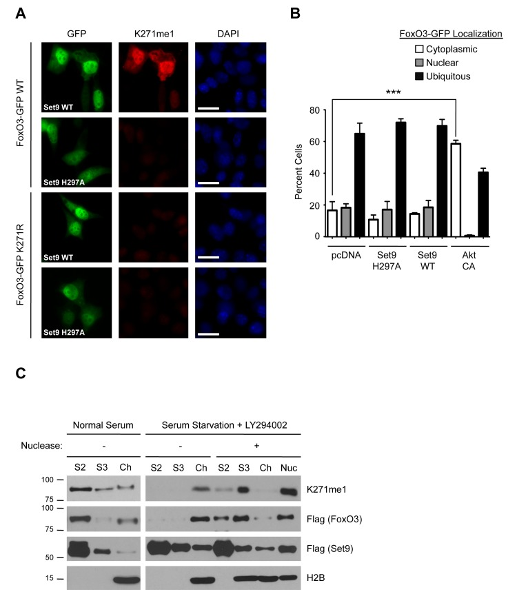 NIH3T3 cells were plated in 6 well plates on poly-L-lysine coated glass coverslips at a density of 106 cells/well. Cells were transfected with FoxO3-GFP or FoxO3-GFP K271R and Flag-Set9 WT or H297A at a ratio of 4μg:6μg Foxo:Set9 using Lipofectamine 2000 (Invitrogen, 10 μl per well), according to the manufacturer's protocol. Cells were fixed 24 hours post-transfection with 4% PFA for 15 min. Cells were then washed 5 times with 1x PBS. Coverslips were blocked with PBS supplemented with 3% BSA and 0.1% Triton X-100 (PBS-BT) and stained with DAPI, mouse anti-GFP 3E6 monoclonal antibody (Invitrogen, 1:500), K271me1 polyclonal antibody (1:500) and appropriate secondary antibodies labeled with Alexa Fluor 488 (anti-mouse IgG) or 594 (anti-rabbit IgG), respectively (Invitrogen, 1:250). Coverslips were mounted using anti-fade mounting medium containing PBS, glycerol and P-phenylenediamine. Coverslips were imaged on an Axiovert 200M (Zeiss) equipped with a CCD camera (Hamamatsu c47429512ERG). Coverslips were imaged in a blinded manner. Contrast enhancement was performed using Photoshop CS3 (Adobe).