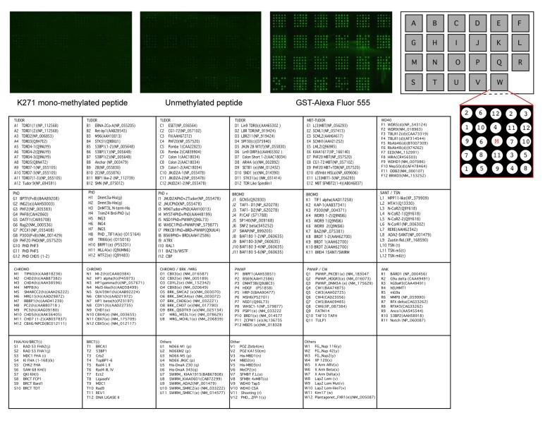 Because methyl-FoxO3 is localized to the chromatin under after serum starvation and LY294002 treatment, we asked if binding proteins that are known to bind to methylated histones could interact with the methylated fraction of FoxO3 (Fig. 6). We used a protein array that contained 265 domains found in chromatin associated proteins [78], many of which are known methyl-lysine binding domains (including TUDOR domains, PhD domains, and chromo-domains) or acetyl-lysine binding domains (including bromo-domains, for a complete list see Fig. 6, lower panels). We probed this protein array with a biotinylated 21 amino acid peptide surrounding K271 of FoxO3 either non-methylated (unmethylated peptide) or mono-methylated at K271 (K271 mono-methylated peptide). Peptide binding to the methyl-lysine binding domains on the array was assessed by immunofluorescence with antibodies to the biotin moiety. We did not observe binding of the K271 mono-methylated peptide for any of the domains present on the protein array (Fig. 6). These data suggest that mono-methylation of FoxO3 does not induce the binding to any of these chromatin-binding domains, although we cannot exclude that in the context of the whole protein, methylated FoxO3 may bind to chromatin-binding proteins that ‘read’ histone marks.