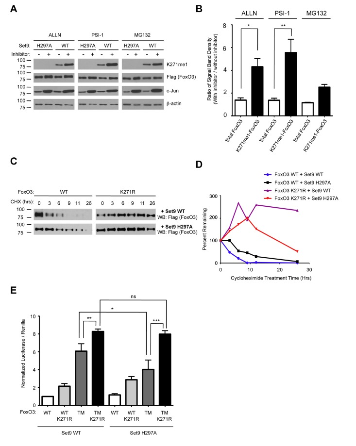 Taken together, these studies indicate that FoxO3 is methylated at lysine 271 by Set9, and that this modification does not affect FoxO3 subcellular localization, but decreases FoxO3 protein stability while eliciting a modest increase in FoxO3 transcriptional activity.